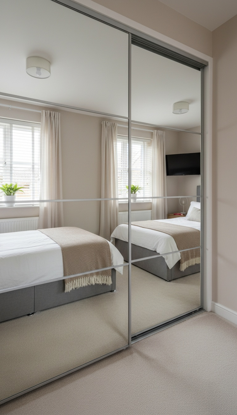 Sliding wardrobes are ideal for full external mirrored doors. Hinged wardrobes work well with mirrors either inside the door or on the outside in smaller sections.